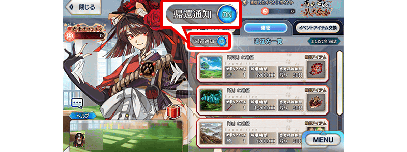 「帰還通知」をONにした状態でアプリを終了すると、犬士が遠征から帰還した際に、プッシュ通知が届くようになります。