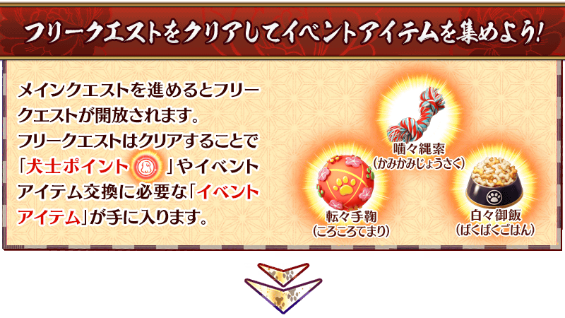 メインクエスト3~5 フリークエスト ※この日時に開放されるメインクエストを進めるには、クエストの進行に応じて以下の犬士ポイントが必要となります。 ・メインクエスト3 必要犬士ポイント 20,000 ・メインクエスト4 必要犬士ポイント 40,000 ・メインクエスト5 必要犬士ポイント 70,000 |