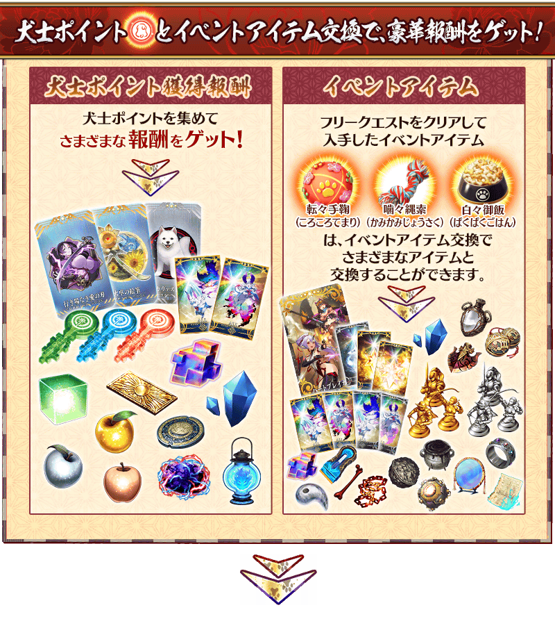 ※伝承結晶、英霊結晶・流星のフォウくんALL★4(HP)、英霊結晶・日輪のフォウくんALL★4(ATK)については、本イベントのメインクエストをクリア後に交換可能になります。 ※イベントアイテム交換期間終了後「転々手鞠」「噛々縄索」「白々御飯」は消滅します。