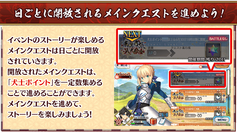 本イベントでは、ストーリーを楽しめるメインクエストは日ごとに開放され、「犬士ポイント」を一定数集めることで進めることができます。