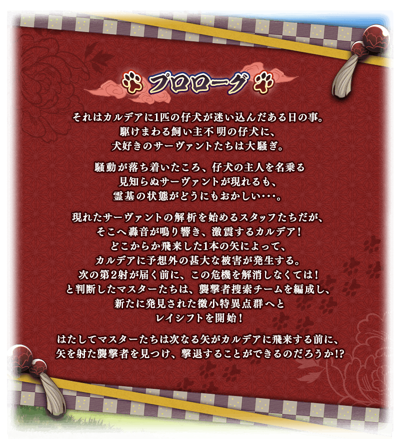 何者かの砲撃により甚大な被害を受けたカルデア。もう一撃を受けたら壊滅を免れないと判断した一行は追撃を防ぐため、発射地点である微小特異点群へとレイシフト。現地で遭遇する八犬士の力を借りつつ、マスターたちは襲撃者の撃退を急ぐ!