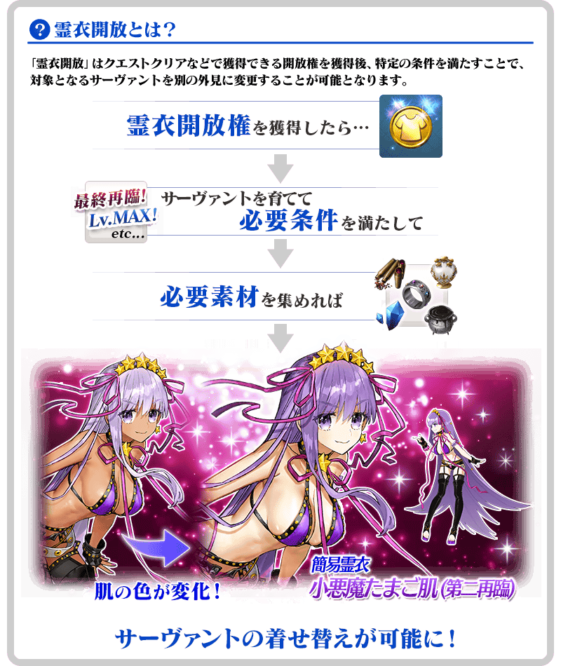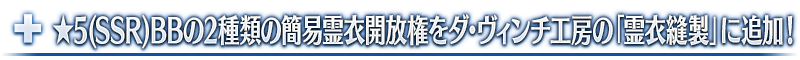 2018年に開催された期間限定イベント「サーヴァント・サマー・フェスティバル!」、および2019年に開催された「復刻:サーヴァント・サマー・フェスティバル! ライト版」で登場した、「★5(SSR)BB」の簡易霊衣「小悪魔たまご肌(第二再臨)」と「小悪魔たまご肌(第三再臨)」の開放権をダ・ヴィンチ工房の「霊衣縫製」に追加!