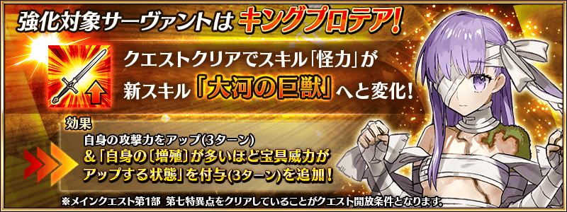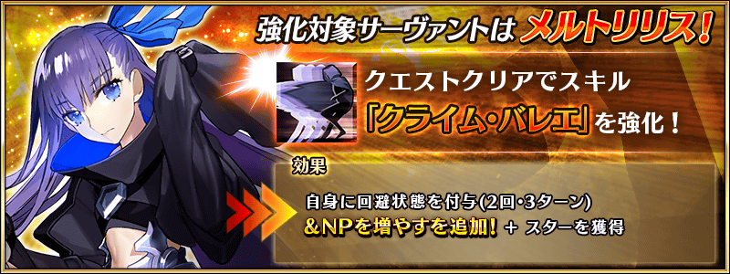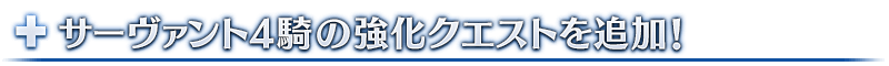 「★4(SR)BB」「★5(SSR)メルトリリス」「★5(SSR)キングプロテア」「★4(SR)パッションリップ」が強化される特別なクエスト「サーヴァント強化クエスト」が、カルデアゲートに恒常的に追加されます。