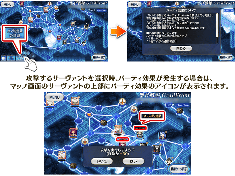 また、敵サーヴァントが複数バトルに参加している場合は、敵にも同様にパーティ効果が発生します。