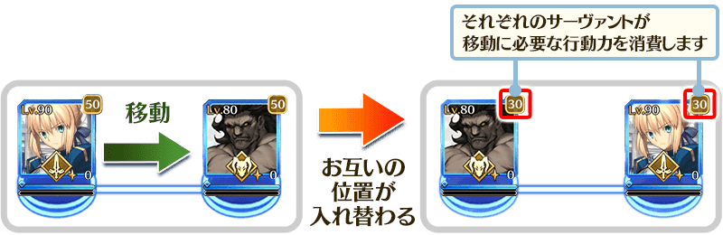 マスターやサーヴァントの位置の入れ替えが発生する際、これまでは一律で行動力を10消費しておりましたが、今回から位置を入れ替えるマスター、サーヴァントのクラスに応じた行動力をそれぞれ個別に消費するようになります。
