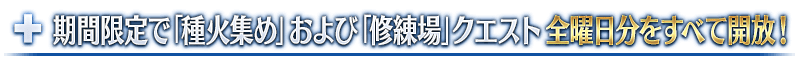期間限定で、カルデアゲート内に曜日ごとに出現するクエスト「種火集め」と「修練場」を全種開放いたします。