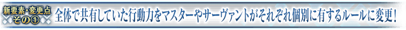 移動や攻撃をおこなう際に必要となる行動力について、これまでの聖杯戦線では味方全体、敵全体で共有しておりましたが、今回の聖杯戦線ではマスターやサーヴァントがそれぞれ個別に行動力を有するルールに変更いたしました。