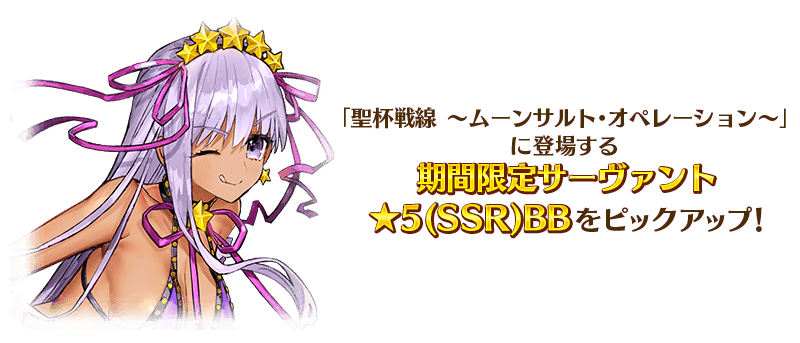 期間限定イベント「聖杯戦線 ~ムーンサルト・オペレーション~」に関連するサーヴァントの中から期間限定サーヴァント「★5(SSR)BB」をピックアップ! ※イベント参加条件を満たしていない状態でも本召喚をおこなえます。
