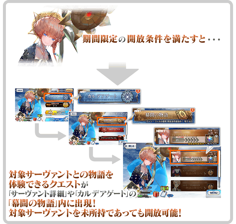 ※対象サーヴァントに複数の「幕間の物語」がある場合、全ての幕間の物語が対象となります。 ※クエストクリア時の報酬内容に変化はございません。