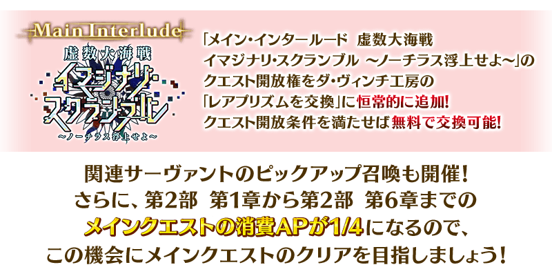 「メイン・インタールード 虚数大海戦イマジナリ・スクランブル ~ノーチラス浮上せよ~」のクエスト開放権をダ・ヴィンチ工房の「レアプリズムを交換」に恒常的に追加いたします。 ※「メイン・インタールード 虚数大海戦イマジナリ・スクランブル ~ノーチラス浮上せよ~」は、2020年に開催された期間限定イベント「虚数大海戦イマジナリ・スクランブル ~ノーチラス浮上せよ~」のメイン・インタールード化に伴い、一部を調整しております。