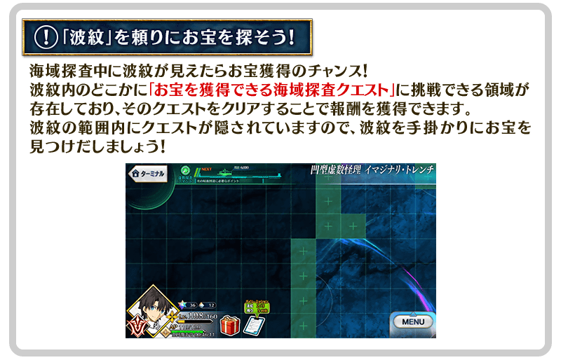 海域探査を進めていくと海域探査クエストが発見できる場合があります。 海域探査クエストには「エネミーが出現する海域探査クエスト」と「お宝を獲得できる海域探査クエスト」の2種類が存在し、「エネミーが出現する海域探査クエスト」では海域探査の行く手を阻む手ごわいエネミーとの戦闘が、「お宝を獲得できる海域探査クエスト」では報酬を獲得することができます。