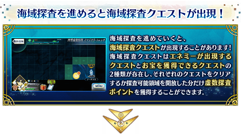 ※「メイン・インタールード 虚数大海戦イマジナリ・スクランブル ~ノーチラス浮上せよ~」における「バトルなし」の海域探査クエストは、デイリーミッション、チュートリアルミッションの「クエストを〇回クリアせよ」にはカウントされません。