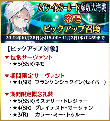 ※2022年11月2日(水) 13:00よりストーリー召喚に追加される下記サーヴァントは本召喚では排出対象外となりますのでご注意ください。