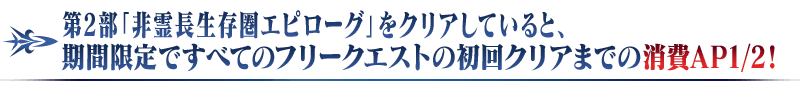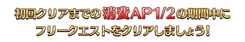 下記の期間中、条件を満たしたマスターを対象に、すべてのフリークエストの初回クリアまでの消費APが1/2になります!(バトルにおいて撤退した場合でも、クエストを初回クリア前であれば同様の消費量になります)