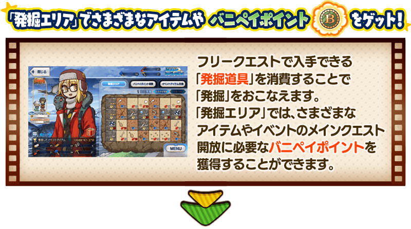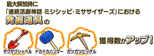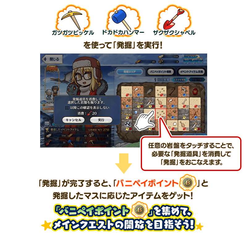 コラボレーションイベント「連続活劇神話 ミシシッピ・ミササイザーズ」では、「発掘」をおこなうことでイベントのメインクエスト開放に必要な「バニペイポイント」やさまざまなアイテムを獲得することができます。
