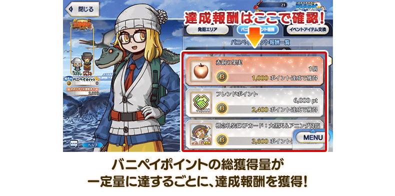 バニペイポイントの総獲得量が一定量に到達するごとに、新たなクエストの開放または達成報酬を獲得できます。