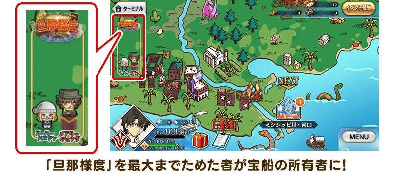 「旦那様度」はシナリオの進行によって増減するので、マスターたちが協力するスーパーバニヤンと、競争相手であるメアリー・アニングのどちらが宝船の所有者にふさわしいかを表す指標として、シナリオの展開とあわせてお楽しみください。