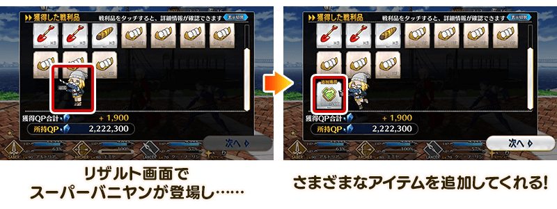 コラボレーションイベント「連続活劇神話 ミシシッピ・ミササイザーズ」では、フリークエストクリア時のリザルト画面において、スーパーバニヤンが登場し報酬を追加してくれます!