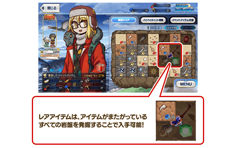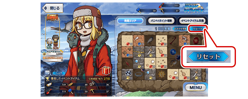 ※発掘エリアに岩盤が残っている状態でリセットをおこなうと、その時点で残っているアイテムを獲得できなくなるためご注意ください。