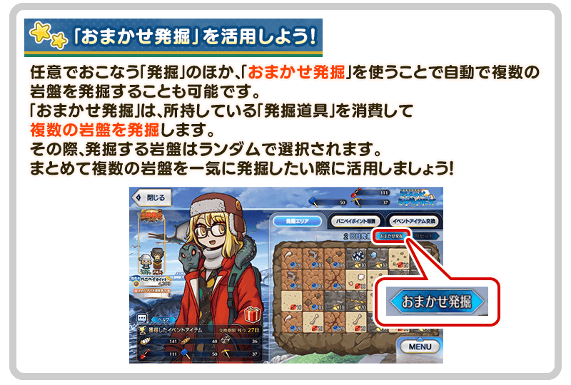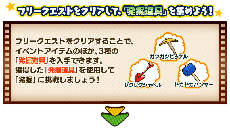 「発掘」は、イベント報酬画面からおこなうことができ、フリークエストで入手できる「発掘道具」(ガツガツピッケル、ドカドカハンマー、ザクザクシャベル)を消費することで実行できます。