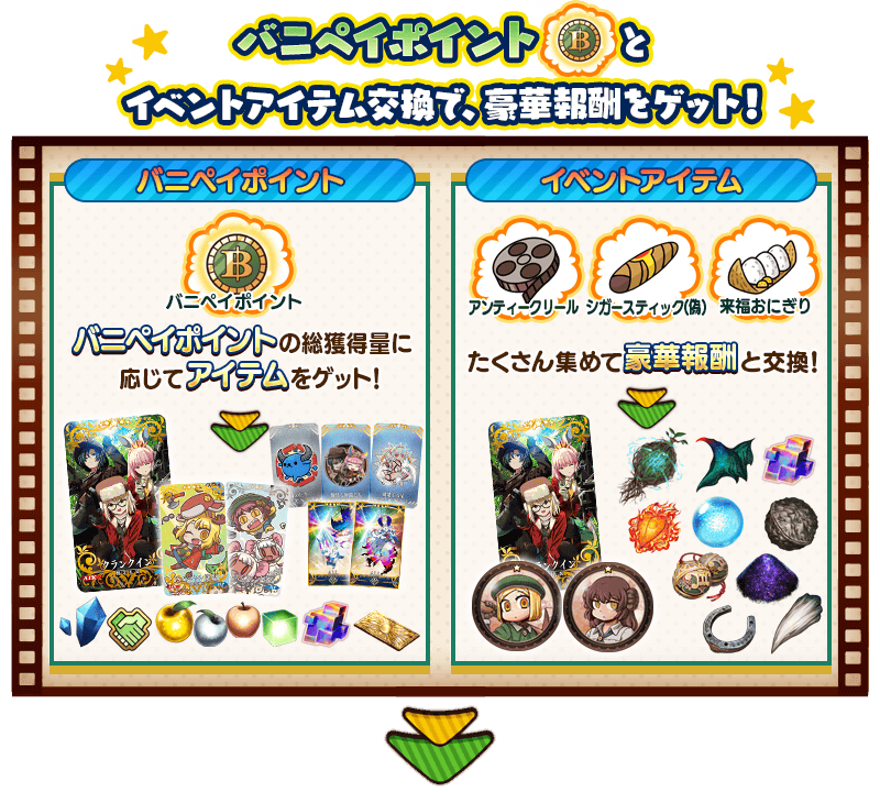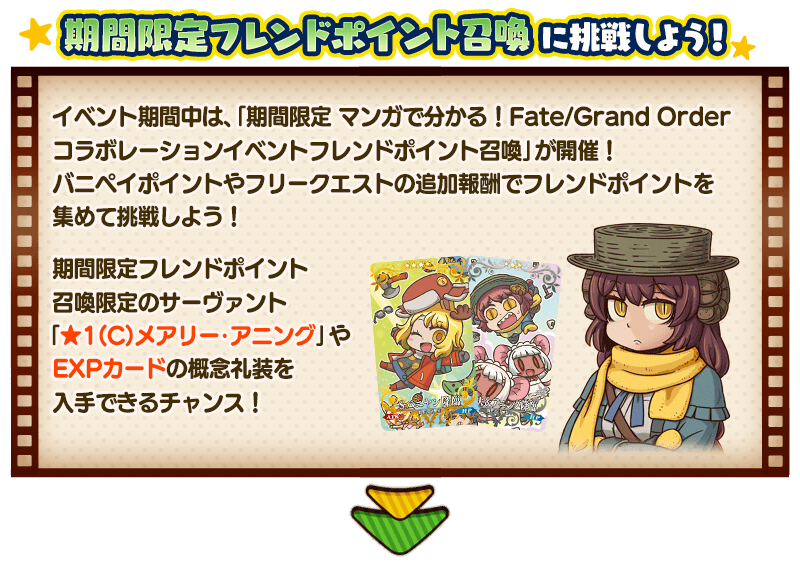 「期間限定 マンガで分かる!Fate/Grand Orderコラボレーションイベントフレンドポイント召喚」からは、通常のフレンドポイント召喚から排出されるものに加え、概念礼装を大幅に強化できるEXPカード「★4(SR)Sバニヤン降臨」「★3(R)大黒天&アニング降臨」が排出されるようになります。