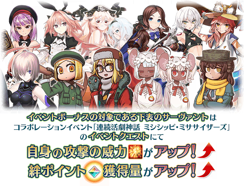 「マンガで分かる!Fate/Grand Order×Fate/Grand Orderコラボレーションイベント」の期間中、一部のサーヴァントはイベントクエストにおける「自身の攻撃の威力がアップ」と「絆ポイント獲得量がアップ」のボーナスが得られます!