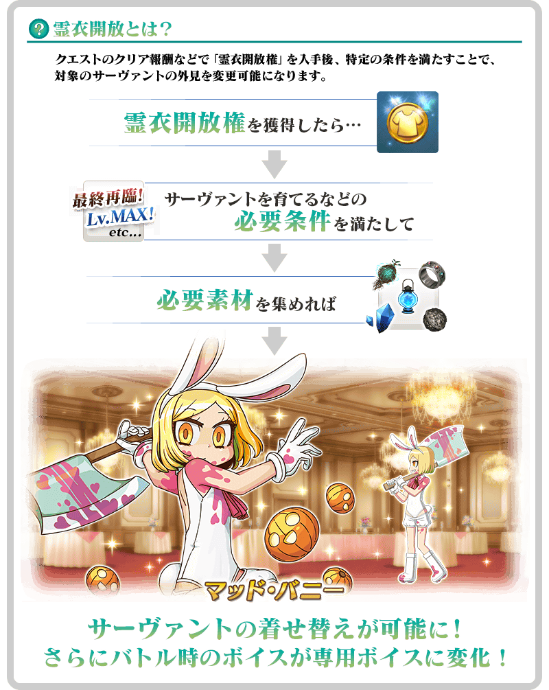 | 霊衣「マッド・バニー」開放権獲得クエスト | 1回 | 5個 メインクエスト第1部 第五特異点をクリアしている場合は無料で交換可能! |