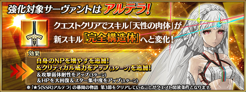 また、「★5(SSR)アルテラ」の場合は、「★5(SSR)アルテラ」の幕間の物語 第3節をクリアしている必要があります。