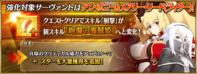 「★5(SSR)アルテラ」「★5(SSR)玉藻の前(ランサー)」「★4(SR)アン・ボニー&メアリー・リード(アーチャー)」「★4(SR)エレナ・ブラヴァツキー(アーチャー)」「★4(SR)アン・ボニー&メアリー・リード(ライダー)」が強化される特別なクエスト「サーヴァント強化クエスト」が、カルデアゲートに恒常的に追加されます。