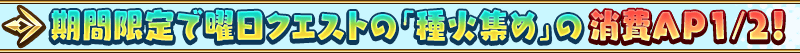 期間限定で、カルデアゲート内に曜日ごとに出現するクエスト「種火集め」の消費APが1/2となります!(バトルにおいて撤退した場合でも、同様の消費量になります)