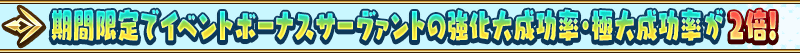 下記の期間中、「マンガで分かる!Fate/Grand Order×Fate/Grand Orderコラボレーションイベント」のイベントボーナスサーヴァントの強化をおこなった際に、大成功(経験値2倍ボーナス)・極大成功(経験値3倍ボーナス)の発生率が期間限定で2倍になります!