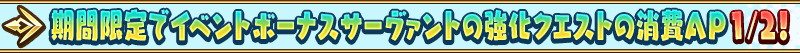 下記の期間中、「マンガで分かる!Fate/Grand Order×Fate/Grand Orderコラボレーションイベント」のイベントボーナスサーヴァントの強化クエストにおける消費APが1/2になります!(バトルにおいて撤退した場合でも、同様の消費量になります)