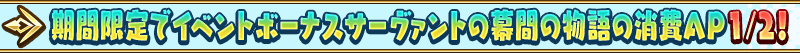 下記の期間中、「マンガで分かる!Fate/Grand Order×Fate/Grand Orderコラボレーションイベント」のイベントボーナスサーヴァントの幕間の物語における消費APが1/2になります!(バトルにおいて撤退した場合でも、同様の消費量になります)