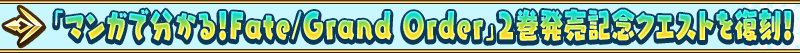 「マンガで分かる!Fate/Grand Order×Fate/Grand Orderコラボレーションイベント」の開幕を記念して、下記の期間中『「マンガで分かる!Fate/Grand Order」2巻発売記念クエスト』を復刻!