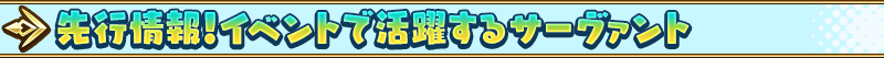 ※対象のサーヴァントとなっていても、本イベントのメインシナリオに登場しない場合があります。 ※4月20日(水) 18:00より、サーヴァント選択画面やサーヴァント強化画面などに、イベントボーナスフィルターが追加されております。イベントで活躍するサーヴァントのみを表示する便利な機能となりますので、こちらもあわせてご活用ください。