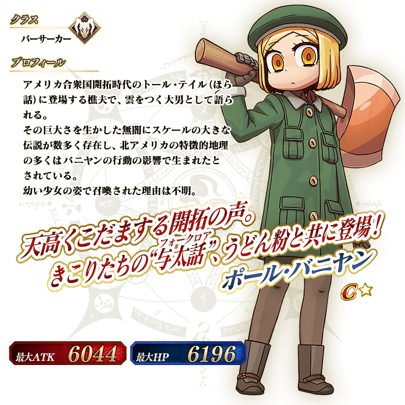 「オール・ザ・ステイツメン! ~マンガで分かる合衆国開拓史~」では、イベントクエストの第一節~第五節を1つクリアするごとに「★1(C)ポール・バニヤン(マンガで分かるバーサーカー)」を1騎ずつ獲得することができます。