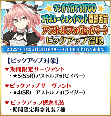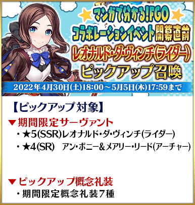 2022年4月下旬に開幕を予定しております、「マンガで分かる!Fate/Grand Order×Fate/Grand Orderコラボレーションイベント」に関連するサーヴァントの中から、期間限定サーヴァントを含む8騎のサーヴァントをピックアップする4種類の召喚を期間毎に切り替わりで開催いたします!
