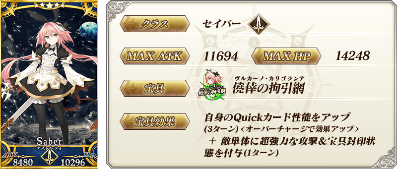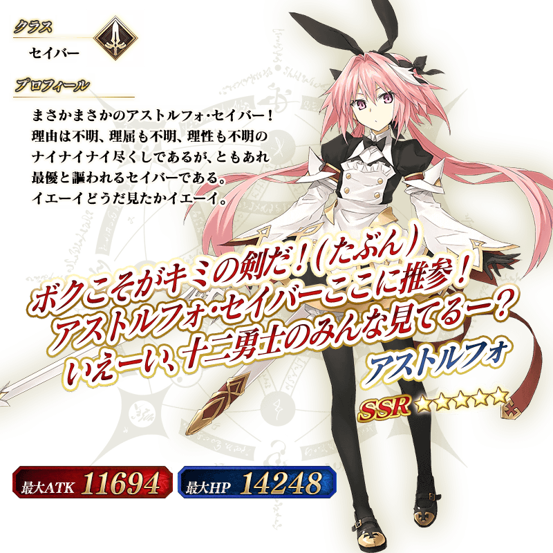 ※上記の「★5(SSR)アストルフォ(セイバー)」のイラストは霊基再臨第3段階のものです。