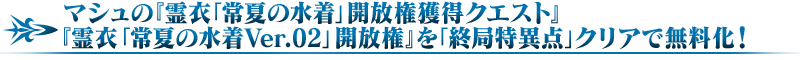 ダ・ヴィンチ工房の「霊衣縫製」にて交換できる「マシュ・キリエライト」の霊衣「常夏の水着」開放権獲得クエストおよび霊衣「常夏の水着Ver.02」開放権が、「終局特異点」をクリアすることで無料で交換できるようになります!