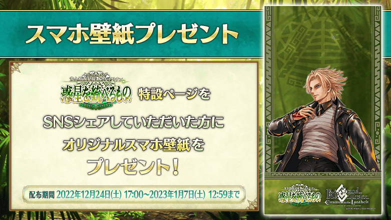 第2部 第7章「Lostbelt No.7 黄金樹海紀行 ナウイ・ミクトラン 惑星を統べるもの」(前編)の特設ページにて、スマートフォン向け壁紙のプレゼントが実施中!