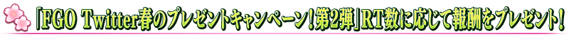第2弾では、公式ツイッターの上部に固定表示されている「FGO Twitter春のプレゼントキャンペーン!第2弾」ツイートのリツイート数が下記の期間内で一定のリツイートを達成すると、ゲームをプレイしているすべてのマスターに豪華アイテムをプレゼント!