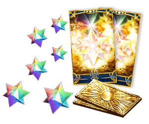 【スタートダッシュログインボーナス合計】 ・聖晶石225個と呼符45枚(聖晶石召喚最大132回分) ※聖晶石召喚最大132回分は、同一の聖晶石召喚をおこなった場合に限ります。 ・黄金の果実42個 ・叡智の猛火ALL★4(SR)300枚 ・420万QP ・フレンドポイント30,000pt