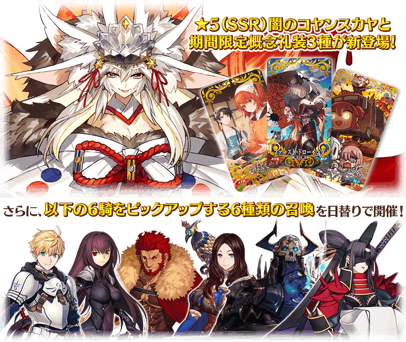 さらに今回は、期間限定★5(SSR)サーヴァント6騎と期間限定概念礼装をピックアップする6種類の召喚を日替りで開催いたします! ※「★5(SSR)闇のコヤンスカヤ」のピックアップ召喚および日替り開催のピックアップ召喚は、それぞれ別の召喚となります。