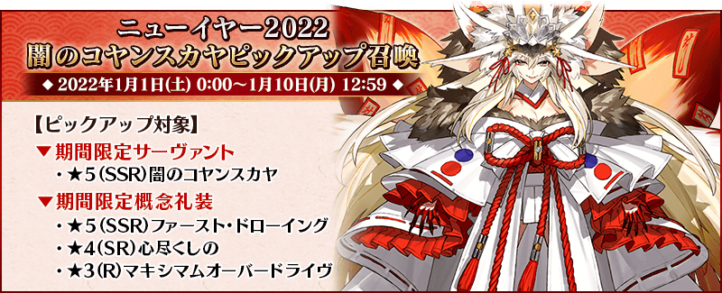 2022年を迎えたことを記念して、新登場の期間限定サーヴァント「★5(SSR)闇のコヤンスカヤ」と、期間限定概念礼装3種をピックアップ!