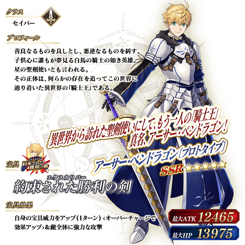 ※上記の「★5(SSR)アーサー・ペンドラゴン〔プロトタイプ〕」のイラストは霊基再臨第2段階のものです。