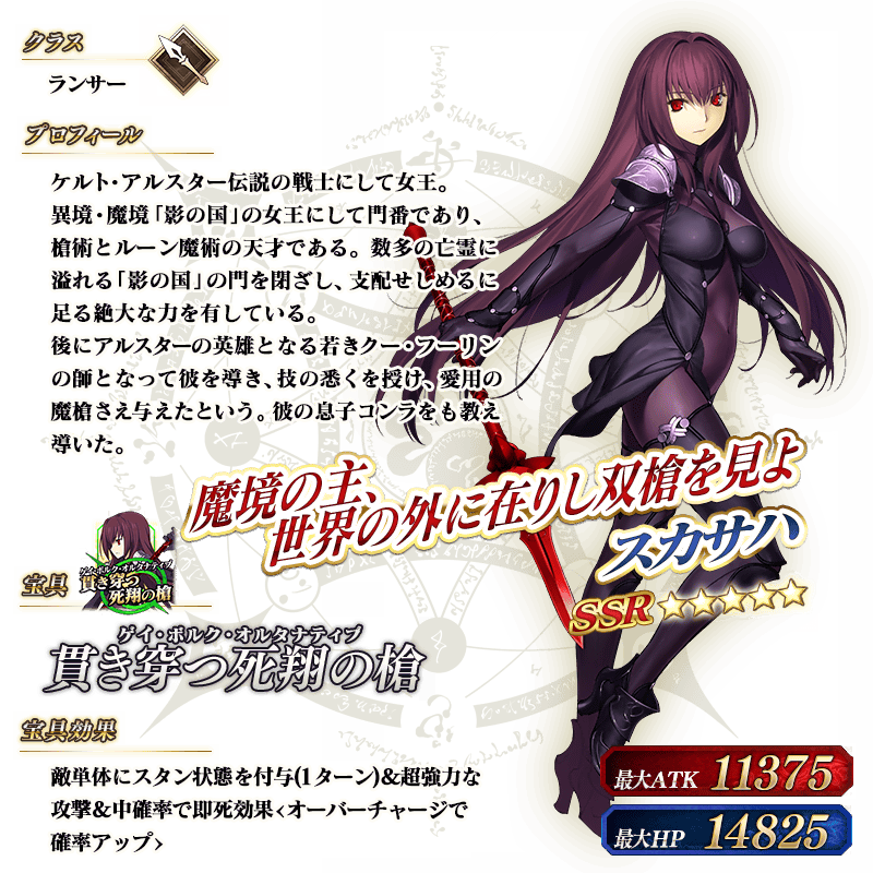※上記の「★5(SSR)スカサハ(ランサー)」のイラストは霊基再臨第2段階のものです。