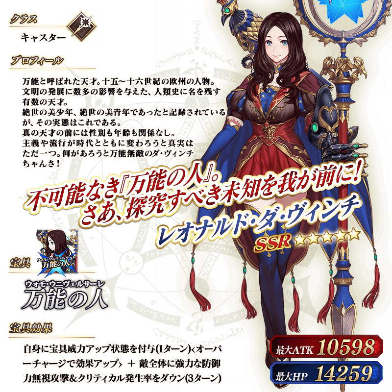 ※上記の「★5(SSR)レオナルド・ダ・ヴィンチ(キャスター)」のイラストは霊基再臨第2段階のものです。