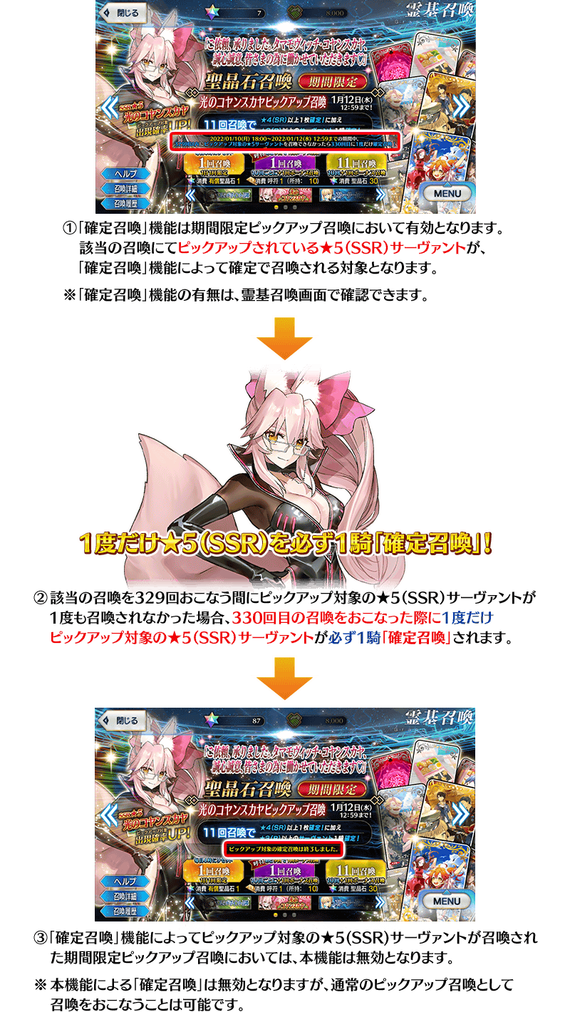 ・期間限定ピックアップ召喚において、329回以内にピックアップ対象の★5(SSR)サーヴァントが召喚されなかった場合、330回目の召喚をおこなった際に1度だけピックアップ対象の★5(SSR)サーヴァントを必ず1騎「確定召喚」できます。