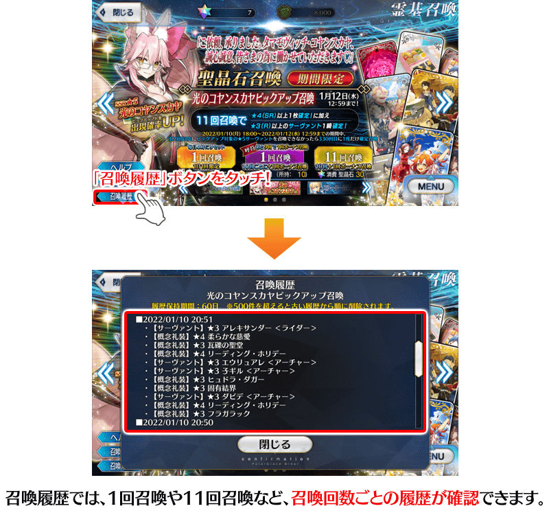 ※召喚履歴は各召喚ごとにダイアログが表示されます。 ※期間限定開催の召喚が終了した場合、該当の召喚履歴を確認することはできなくなりますのでご注意ください。 ※各霊基召喚ごとに表示される履歴の最大数は500件までとなります。11回召喚をおこない最大数を超えた場合に限り、500件を超えて表示されます。