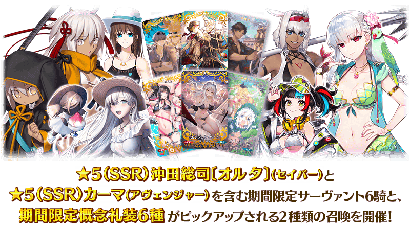 期間限定イベント「アークティック・サマーワールド! ~カルデア真夏の魔園観光~」の開催を記念して、2021年の水着イベントで登場した「★5(SSR)沖田総司〔オルタ〕(セイバー)」「★5(SSR)カーマ(アヴェンジャー)」を含む期間限定サーヴァント6騎と、期間限定概念礼装6種をピックアップする2種類の召喚を開催いたします!